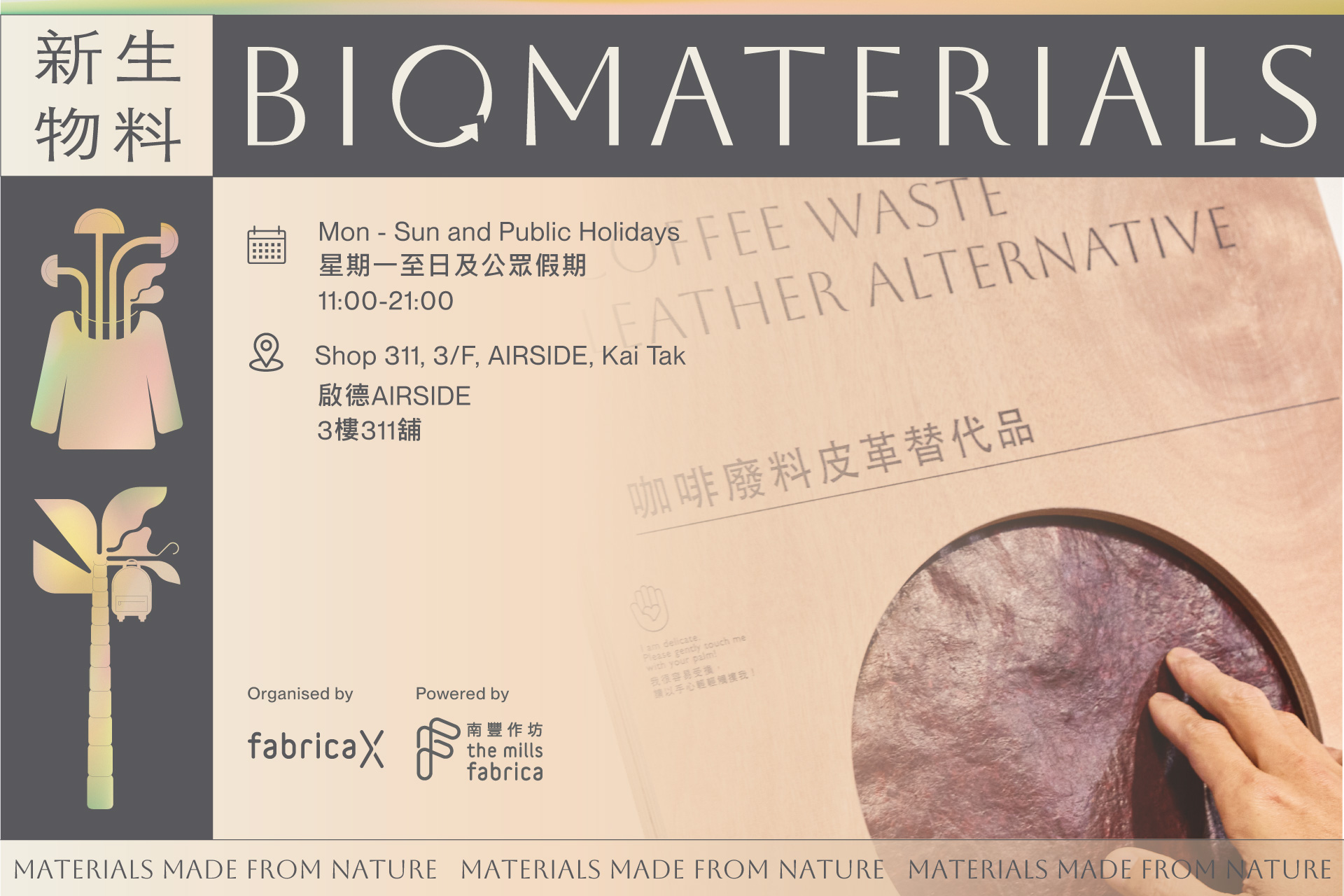 We are relaunching Fabrica X’s signature Biomaterials Exhibition this summer at our AIRSIDE store. Following the successful debut in 2023, this revamped exhibition will run for a limited three-month period, aiming to accelerate the development and promotion of biomaterials while inspiring a transformative shift in public awareness and attitudes toward sustainable materials.